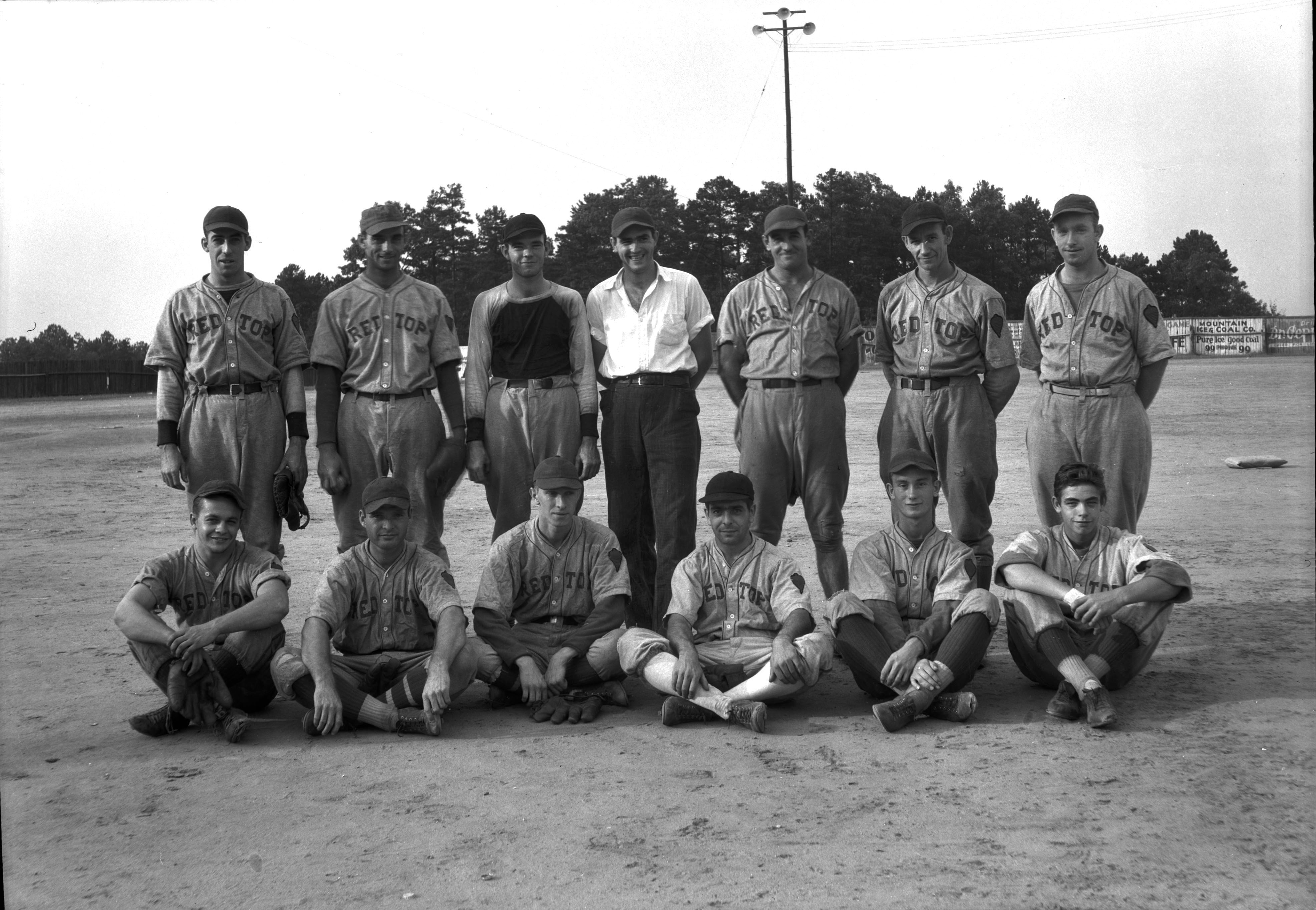 Left to right: Front row: Harlan Murray, Pose Owen, Unknown, Laird Jacob, Unknown, "Little Rooster" Deal. Back row: Unknown, Unknown, Claude Owens, Unknown, Will Bumgarner, Willie Arrowood, "Red" Branch. Photograph by Greene Studio Sept. 25, 1936. |