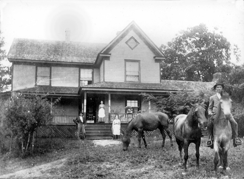Home of William Alexander Kincaid (1853- 1947) and Harriette Loretta McGimsey Kincaid (1853-1936) who are standing at bottom of steps. Susan Kincaid Hemphill (1889-1969) is standing at top of steps. The Kincaid's son, Thomas Monroe Kincaid (1887- 1977) is on a horse.