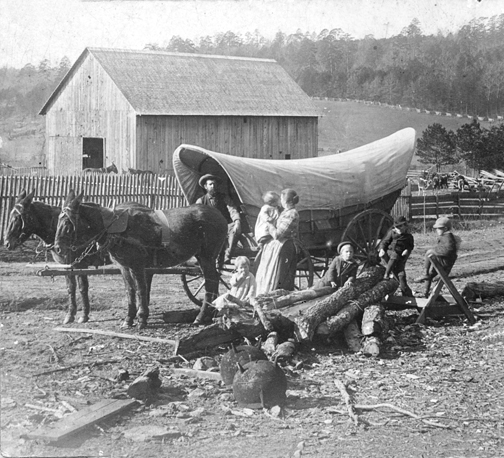 Pictured with a Conestoga wagon at 1685 Bost Road, Morganton, NC. Barn was built in the fall of 1896 from lumber which was sawmilled on the farm. Left to right: George Shuford Ramseur (1863-1919); Baby in arms, Daniel Elkana Ramseur; (1899-1991), Anna Forney Ramseur (1863-1950); girl on log, Katherine Elizabeth Ramseur (1898-1941); Clarence Macon Ramseur (1896-1988); George Lewis Ramseur (1895-1930); William Forney Ramseur (1892-1979). |