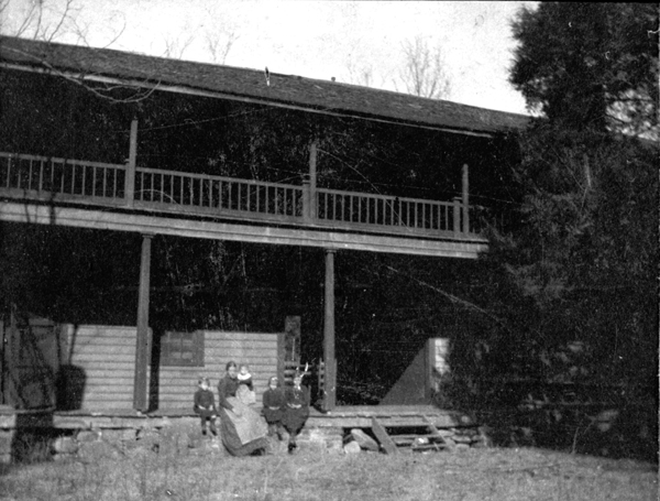 hotel was destroyed in the Flood of 1916. Julia Crites and her children are seated on the steps.